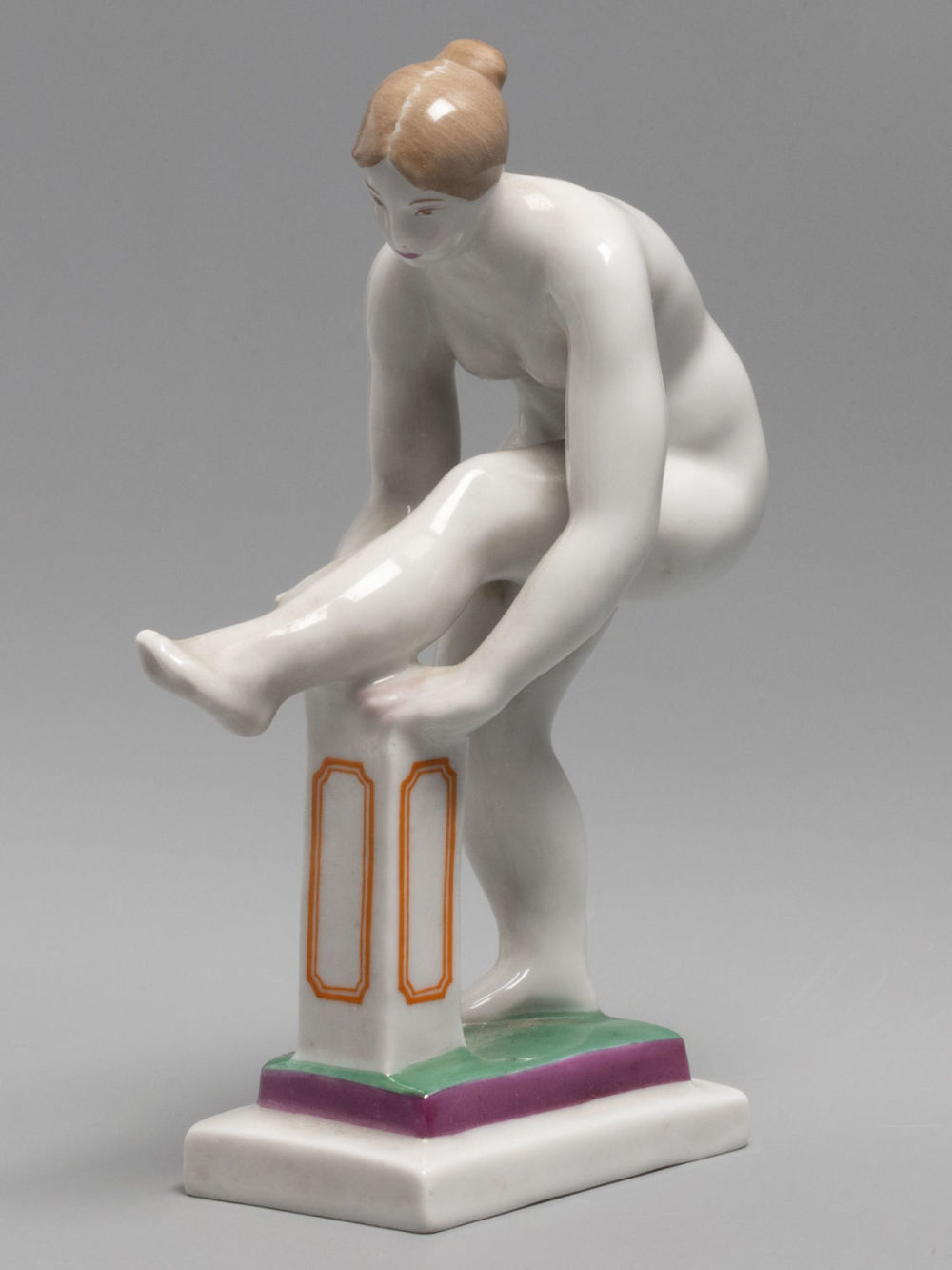 Авт. А.Т.Матвеев. «Заноза (надевающая чулок)». Банная серия. Статуэтка. Фарфор. ЛФЗ. 1960-е гг.