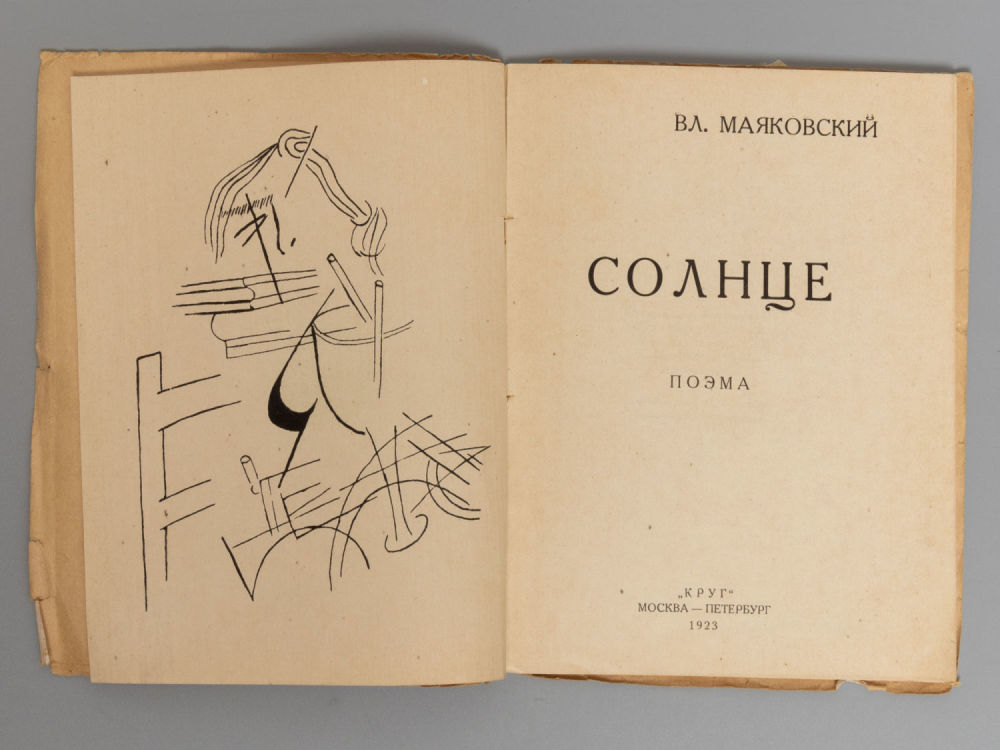 Маяковский В.В. Солнце. Поэма. [Обложка и рисунки работы художника М. Ларионова]. - М.-Пб.: Круг, 1923. - [32] с., илл. Мягкая издательская обложка. Формат 170х130 мм.
