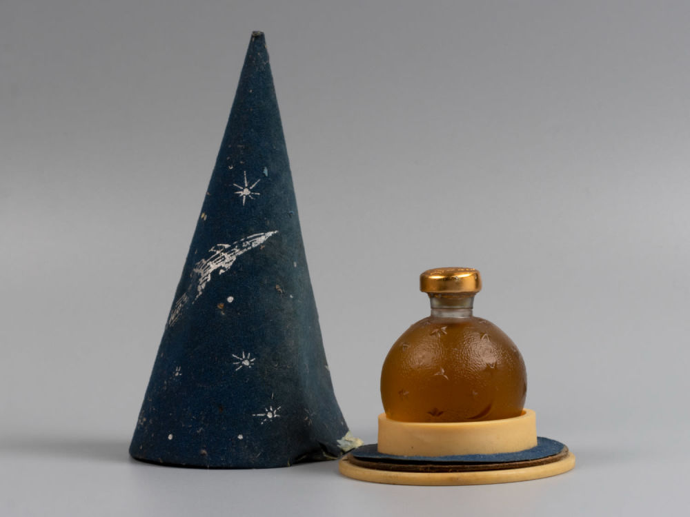 Благодаря гениальной задумке советских оформителей, золотистая душистая жидкость красиво светится сквозь прозрачные звезды и летящую ракету, которыми декорирован матовый шарообразный флакон. Горлышко флакона закрыто металлическим капсюлем, поэтому дополнительно прилагалась небольшая притертая пробка. Темно-синий конусообразный футляр с острой вершиной олицетворяет манящую глубину космоса и стремление ввысь. Коробка с названием духов и звездами напоминает колпак звездочета.