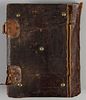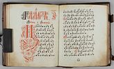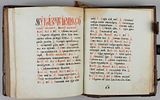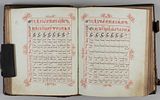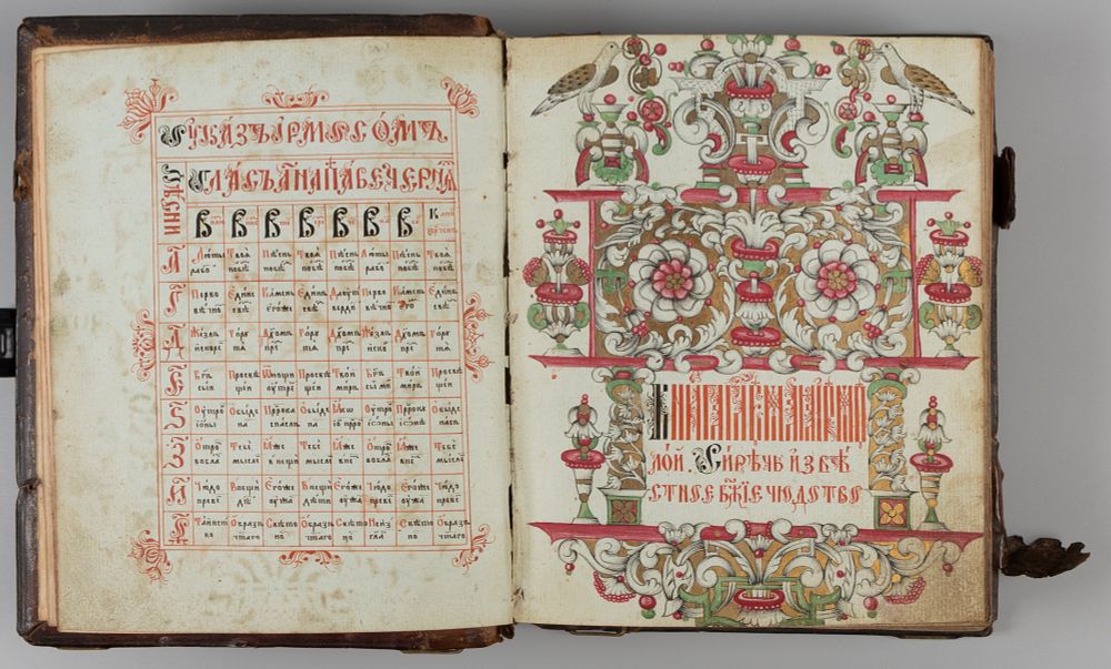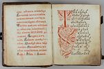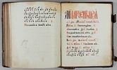 Ирмологий на крюковых нотах. Старообрядческая рукопись. Сиречь известное божие чудотворение, пророческие проповеди. Преподобного Иоанна Дамаскина. [Россия, середина XIX в. - начало XX века[. – [4], [220], [2] л. Полуустав двух почерков. Буквицы и титульный лист в поморском стиле. Доски обтянутые тисненой кожей. Застежки. На задней крышке металлические жуковины. Тройной тонированный в алый обрез. Формат 220х170 мм.