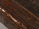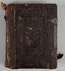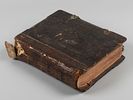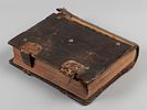 На переплете раскол дерева по линии соединения нижней крышки и корешка. На корешке утраты материала в верхней части. Ремни застежек частично утрачены. Нижняя накладка под застежку утрачена. На переплете сбитые уголки, потертости, следы жучка. Блок подрезан. В блоке трещины, некоторые листы отходят от блока по основанию, следы листания. На форзаце и листах [1-4], [2] следы затека, прорехи и пятна от ржавчины.