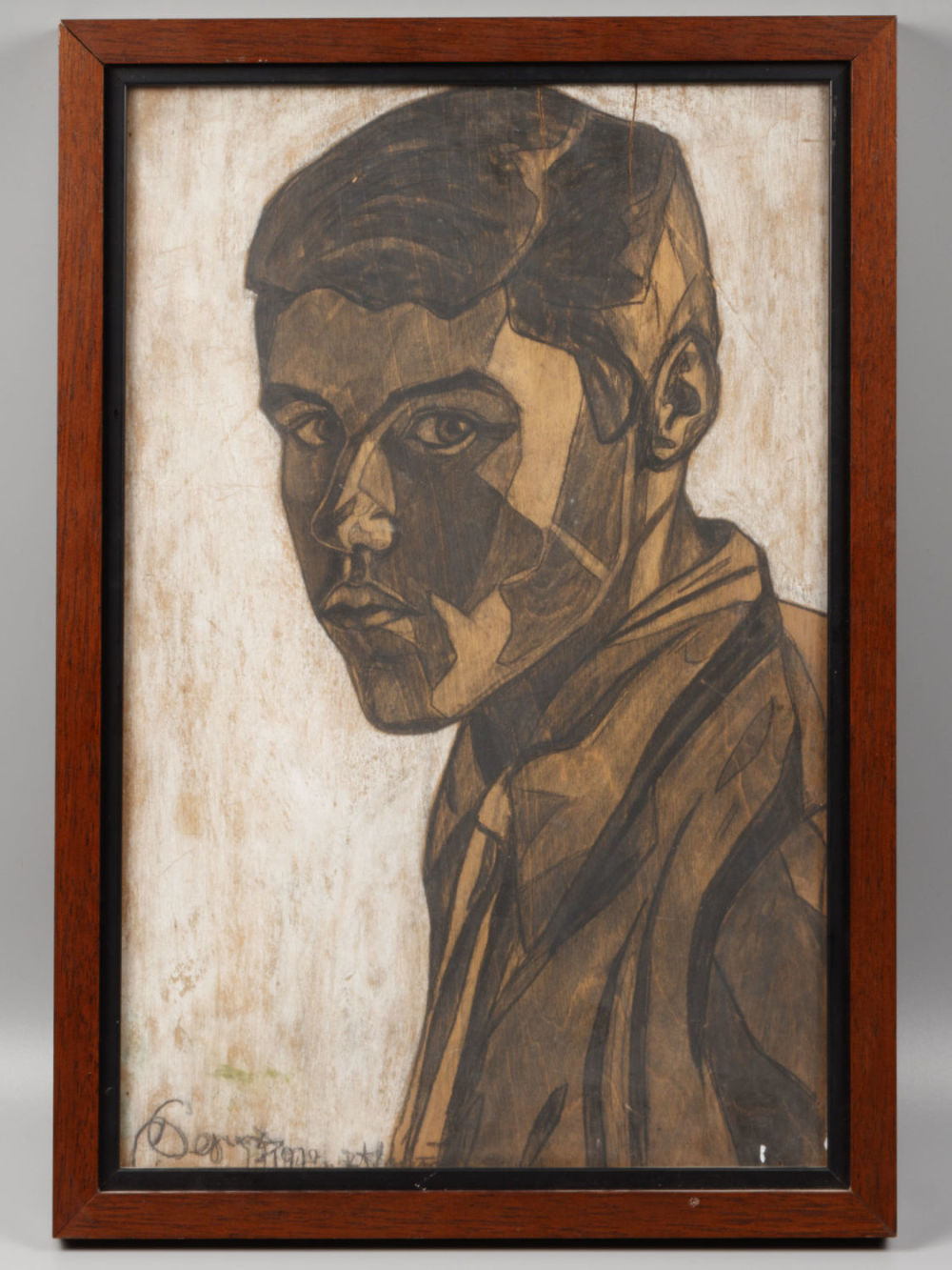 Рерих, С. Н. Портрет Юрия Рериха. 1917. Слева внизу подпись: «СРерих 1917 (неразборчиво)». Фанера, карандаш, белила. Размер 40,8х27 см. Оформлено в раму. Провенанс: Из собрания Г. П. Попова.